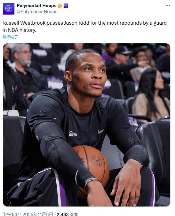 同时本场抓下16个篮板后,威少生涯总篮板数来到8734个,正式超越基德成为NBA历史后卫篮板王。